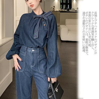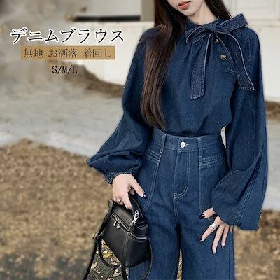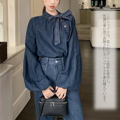 ボウタイブラウス レディース 長袖 プルオーバー ブラウス デニム ボウタイ トップス プチハイネック シャツブラウス バルーン袖 ボリュームスリーブ 斜めボタン 春秋 春 カジュアル おしゃれ デニ
