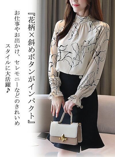 斜めボタン ブラウス 立ち襟 フリル 長袖 シャツブラウス レディース オフィス フォーマルブラウス フォーマル シャツ 花柄 バンドカラー 春 秋 長袖ブラウス シフォン お呼ばれ OL 仕事 学校