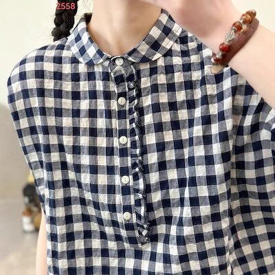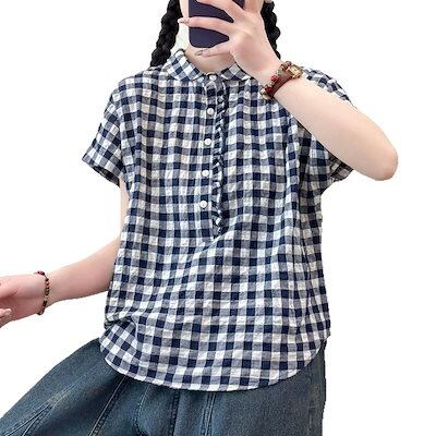 ブラウス 韓国風 ブルー チェック 半袖 ターンオーバーカラー 木耳カラー シャツ レディース ゆったり カジュアル 汎用 半袖 トップス シングルボタン