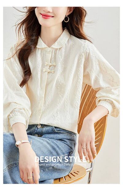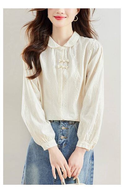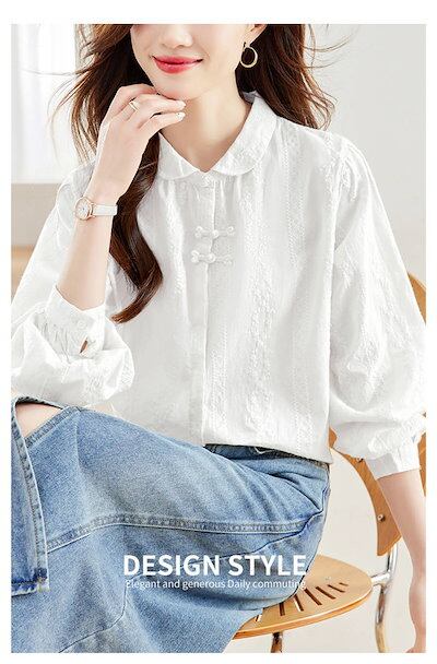 丸襟 シャツ ブラウス 長袖 花柄 刺繍 綿100% 秋 春 冬 シャツブラウス レディース ブラウス チャイナボタン トップス 白シャツ 長袖シャツ 大きいサイズ 上品 きれいめ フォーマル カジュ