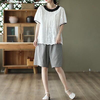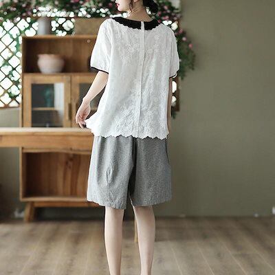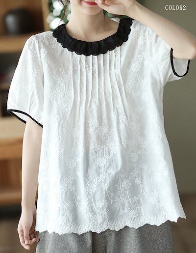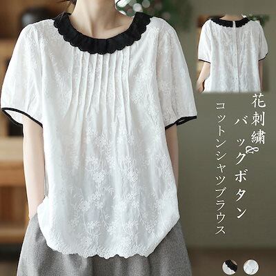 ブラウス クルーネック シャツブラウス レディース 半袖 プルオーバー ブラウス バックボタン コットンレース ゆったり タック入り 大きいサイズ 花刺繍 薄手 綿 日焼け止め トップス コットン 体