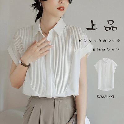 シャツ ブラウス レディース シャツブラウス 半袖 半袖シャツ トップス チュニック 夏 白シャツ ホワイト きれいめ フレンチスリーブ ピンタック タック 折り襟 ゆったり 前開き ボタン留め カジ