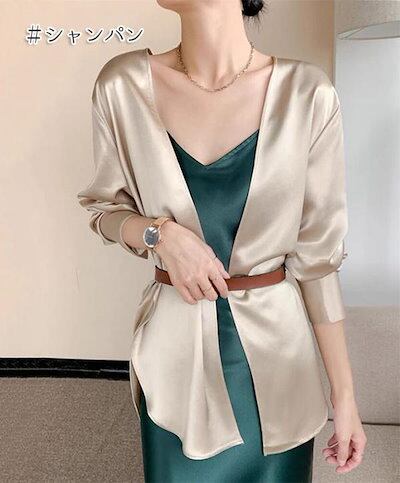 サテンシャツ ボレロ レディース ノーカラー シャツ 夏 長袖 大人 日焼け対策 uv対策 体型カバー 薄手トップス ボタンなし タレ感 前開き 微透け 透け感 ゆったり カジュアル シャツ