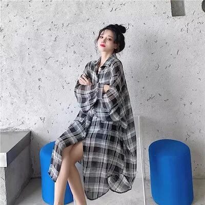 シアーシャツ チェック柄 長袖 シャツブラウス レディース ファッション 可愛い かわいい 透け感 膝上 折り襟 ボタンシャツブラウス 韓国系 カジュアル オーバーサイズ 羽織り