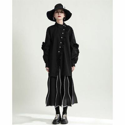 【急速出荷!】フリルブラウス シャツ ブラウス レディース トップス ロング丈 デザイン襟 長袖 斜めボタン 胸元フリル タック 無地 きれいめ モード系 変形デザイン アシンメトリーシャツ オケージ