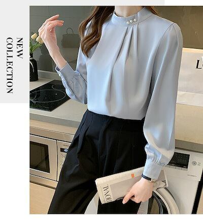 ブラウス 長袖 レディース シャツ スタンドカラー シフォン スーツインナー フォーマル タック 立ち襟 パール風 ファッション 体型カバー 着痩せ おしゃれ 可愛い プ エレガント
