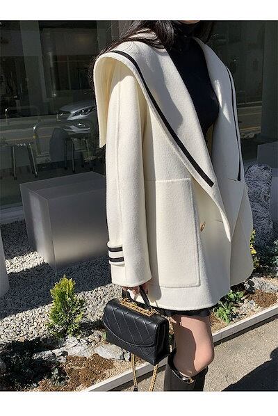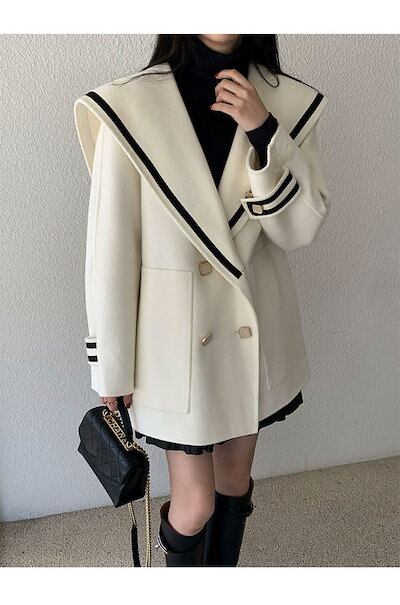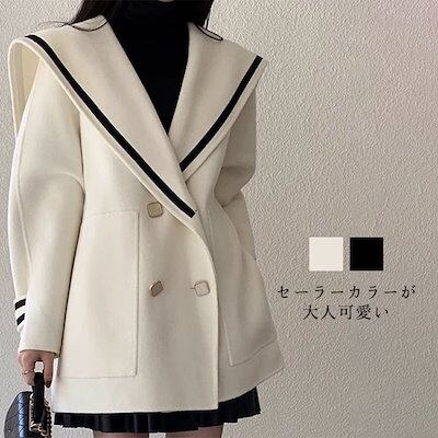 コート レディース セーラーカラー アウター トップス ダブルボタン 大きな襟 秋冬 おしゃれ 体型カバー 暖かい カジュアル キレイめ 大人 可愛い トレンド感 大きいサイズ ホワイト ブラック韓国