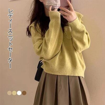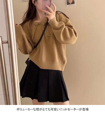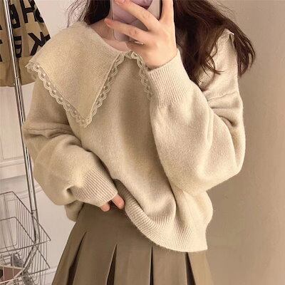 ニットセーター 長袖 セーター レディース ニット フリル襟 レース付き プルオーバー リブ 厚手 暖かい トップス ドロップショルダー アウター 大人可愛い おしゃれ シンプル 無地 カジュアル 快