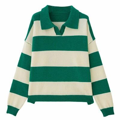 ニットセーター レディース ニットトップス トップス プルオーバー 秋冬 折り襟 ポロ襟 ボーダー柄 ゆるニット セーター リブニット 長袖 ゆるセーター maoyi-407-gg 海外通販