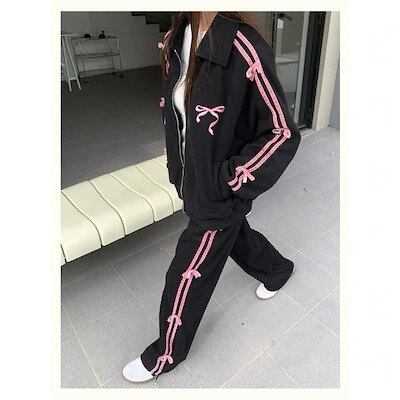 ジャージ 春服 通学 春 可愛い 韓国ファッション 上下セット ジップアップ スウェット 長袖 セットアップ アウター ロングパンツ レディース スポーツ カジュアルオールインワンセットアップセッ(2