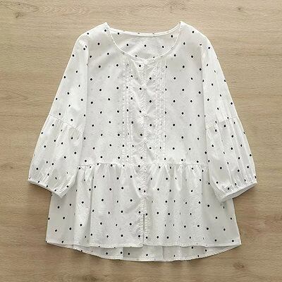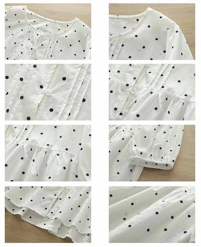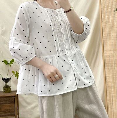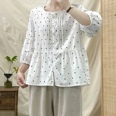 半袖シャツ ブラウス 綿 レディース トップス フレア シャツ 七分袖 春夏 綿シャツ 大人可愛い 白 薄手 ドット柄 コットンブラウス クルーネック 大きいサイズ ボリュームスリーブ ボタン 前開き