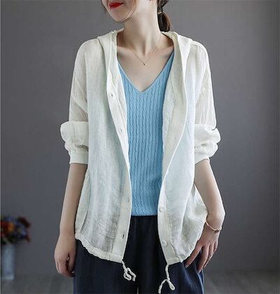 カーディガン パーカー UVカット 綿麻 コットン ン 綿麻カーディガン サマーカーデ レディース トップス フード付き 薄手 長袖 透け感 フロントボタン 羽織り 夏 カットソー ショート丈 紫
