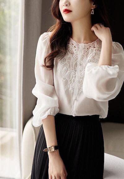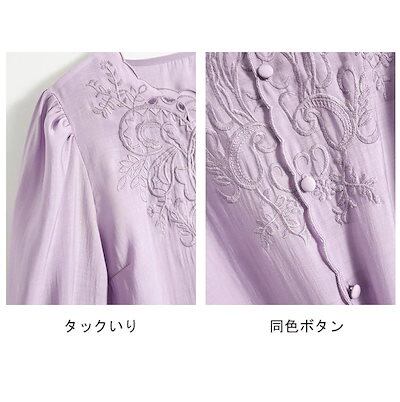 刺繍ブラウス長袖レディースシャツトップスフリル襟シャツブラウスノーカラーバルーンスリーブゆったり前開きボタンおしゃれ薄長袖tシャツ羽織り羽織る春夏304050通勤フォーマルオフィス仕事黒白紫