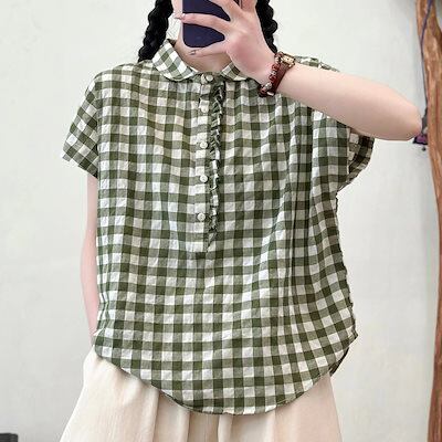 ブラウス 韓国風 ブルー チェック 半袖 ターンオーバーカラー 木耳カラー シャツ レディース ゆったり カジュアル 汎用 半袖 トップス シングルボタン