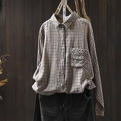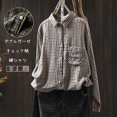 長袖 シャツ シャツブラウス ダブルガーゼ 綿シャツ レディース 長袖トップス ブラウス チュニック 綿 コットン トップス チェック柄 折り襟 チェック 春 長袖ブラウス 夏 通気性 ボタン留め 前