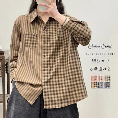 長袖 シャツ シャツブラウス レディース 長袖トップス 綿 ブラウス チュニック トップス 綿シャツ コットン チェック柄 ストライプ 折り襟 チェック 切り替え 春 長袖ブラウス 夏 通気性 ボタン