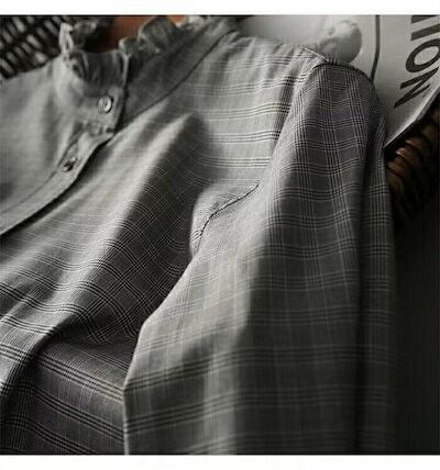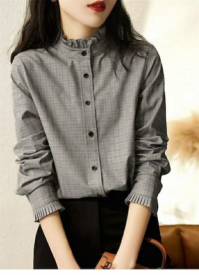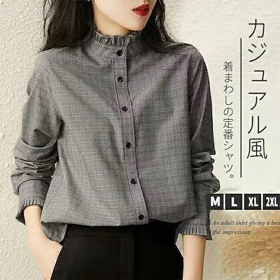 シャツ ブラウス トップス レディース シャツブラウス 長袖 立ち襟 フリル襟 オフィス チェック柄シャツ チェック柄 フォーマル 前開き ボタン付き 春 秋 長袖ブラウス 体型カバー 大人 春秋 綿