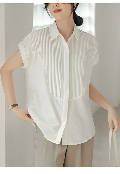 シャツ ブラウス レディース シャツブラウス 半袖 半袖シャツ トップス チュニック 夏 白シャツ ホワイト きれいめ フレンチスリーブ ピンタック タック 折り襟 ゆったり 前開き ボタン留め カジ