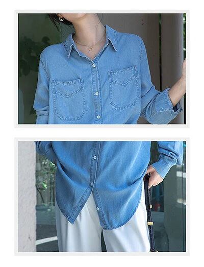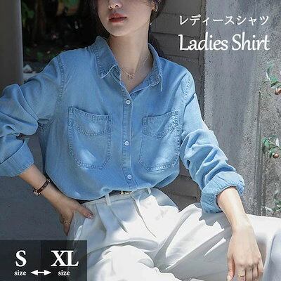 最終在庫デニムシャツ ブラウス レディースシャツ トップス 薄手 涼しい 前開き ボタン 胸ポケット 長袖あり 袖付き カジュアル リゾート おしゃれ サマー 韓国風 可愛い かわいい 夏 デニムブル