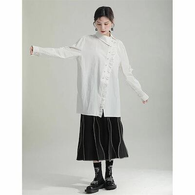 【急速出荷!】フリルブラウス シャツ ブラウス レディース トップス ロング丈 デザイン襟 長袖 斜めボタン 胸元フリル タック 無地 きれいめ モード系 変形デザイン アシンメトリーシャツ オケージ