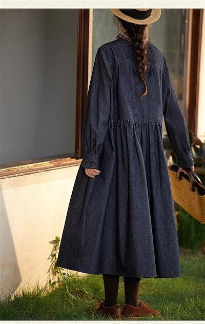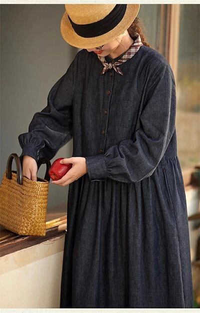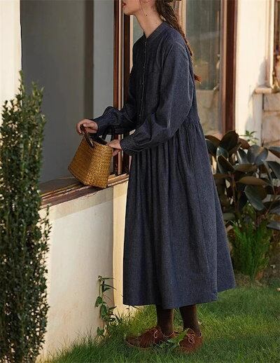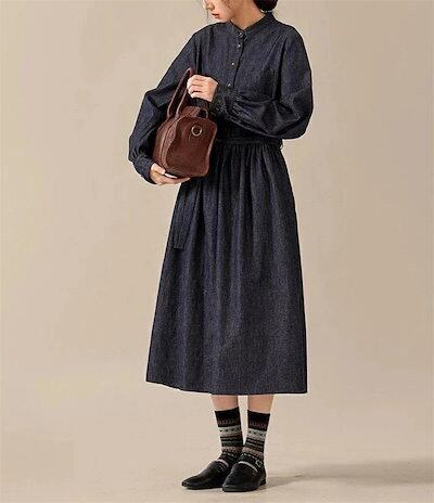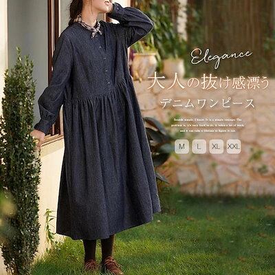 【急速出荷!】シャツワンピース 春 デニムワンピース レディース 長袖 シャツワンピース 柔らかなデニム バンドカラーシャツワンピース スタンダードカラー ミモレ丈 ゆったり ロングワンピ キレイめ