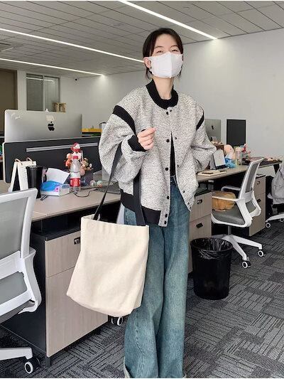 シンプル!ノーカラーコート春アウター通勤フレンチレトロコート春秋作ゆったり野球ウェアジャケットレディース韓国ファッション