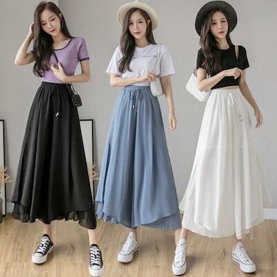 ワイドパンツ レディース ボトムス ガウチョパンツ シフォン 裾プリーツ フレアパンツ ガウチョ パンツ ボトムス スカーチョ ゆ