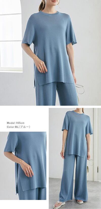 カレイkarei セットアップ レディース 半袖 冷感素材 Tシャツ サマーニット ワイドパンツセット ガウチョパンツ スリット入 01OS7813-1