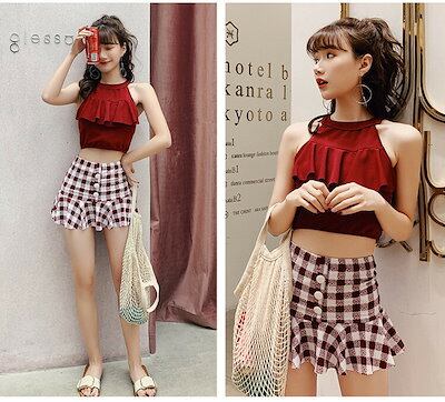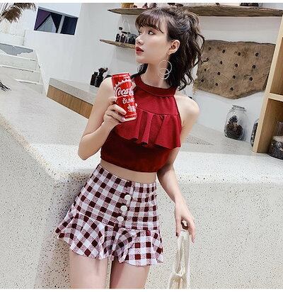 水着 レディース 体型カバー 露出控え ビスチェ レディース水着 タンキニ セパレート オトナ女子 みずぎ 韓国ファッション チェック柄 小胸も安心 海 プール リゾート 旅行
