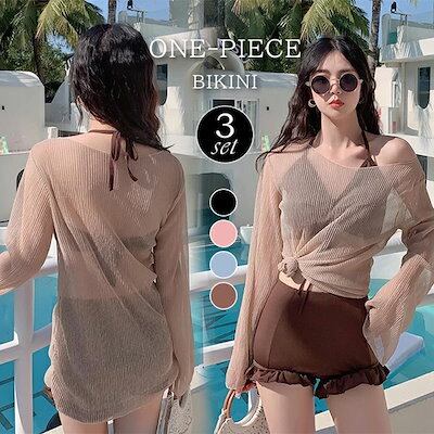 3点セット 水着 体型カバー 韓国風 ビキニ レディース 露出控えめ トップス セクシー かわいい セットアップ オトナ女子 ママ水着 大きいサイズ 高校生 大学生 スクール 女性向け 盛れる 海水浴