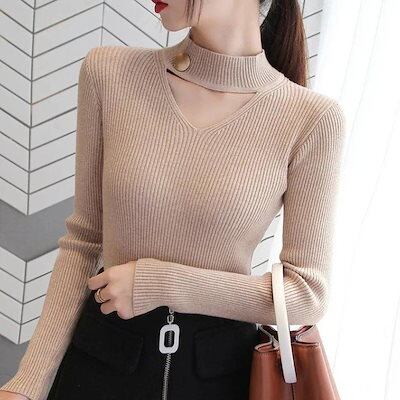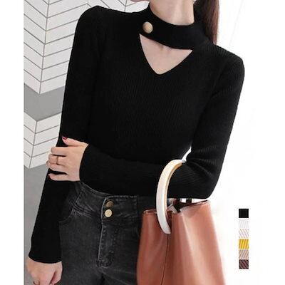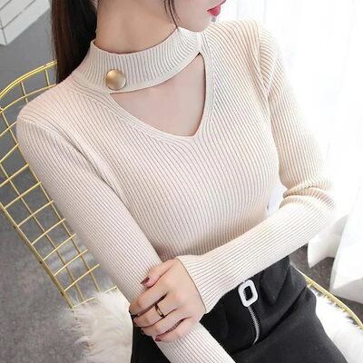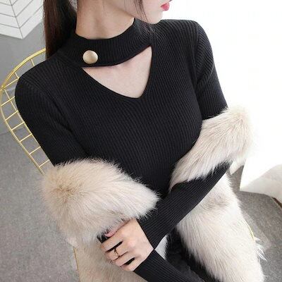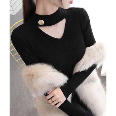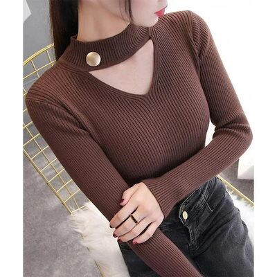 韓国ファッションチョーカー風リブニットレディースニットカットソーセーターセクシープルオーバーおしゃれきれいめ