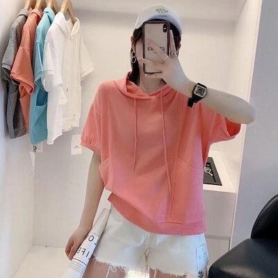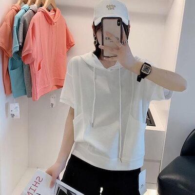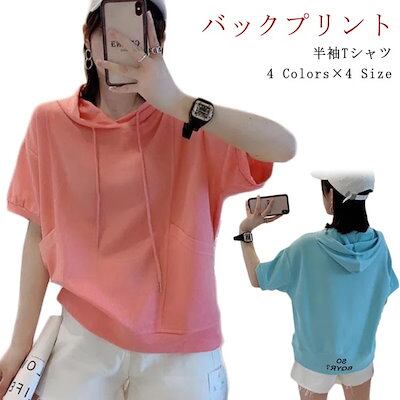 半袖 パーカー 夏 秋 Tシャツ レディース トップス カットソー 半袖 黒 ポケット付き バックプリント カジュアル おしゃれ Tシャツ