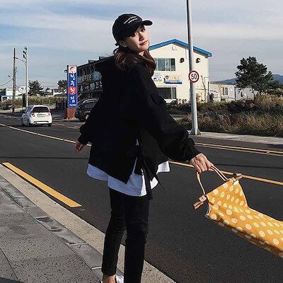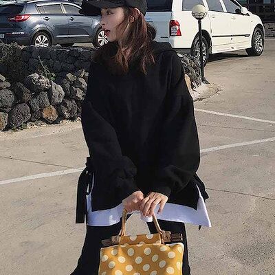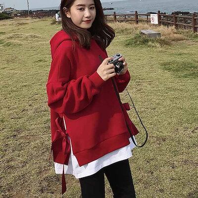 パーカー レディース プルオーバー 長袖パーカー 無地パーカー ゆるパーカー フード付きパーカー 切り替え 重ね着 レイヤード ルーズ ゆったり ドロスト付き 大人用 BF風 韓国ファッション シンプ