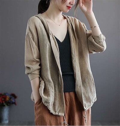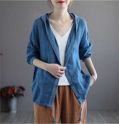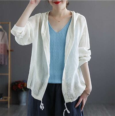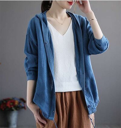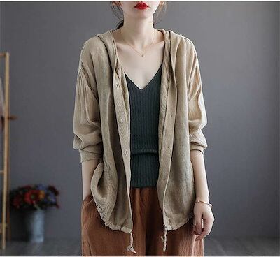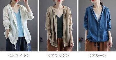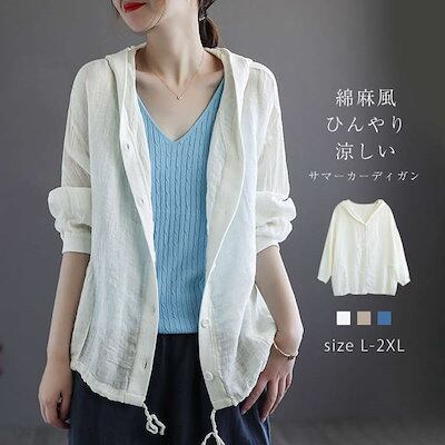 カーディガン パーカー UVカット 綿麻 コットン リネン 綿麻カーディガン サマーカーデ レディース トップス フード付き 薄手 長袖 透け感 フロントボタン 羽織り 夏 カットソー ショート丈 紫