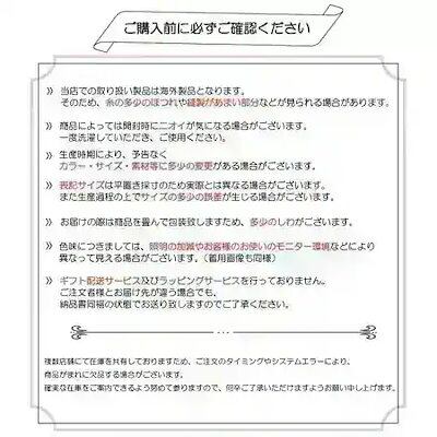 イメージ違い、サイズ違い等による返品は基本的にお受けできません。ただ、ご不便な点がありましたら商品到着の1週間以内にご連絡ください。海外製品は日本製の物に比べて、多少品質が落ちます。糸の端の未処理、少し縫い直すことで修繕できる範囲のほつれなどは基本的に返品の対象外ですので、ご了承ください。当店で検品の上、お客様へ出荷を致しております。万が一、開封時の破れ、シミ、明らかに掲載写真と別の物が到着した場合は、商品到着の【1週間以内】に 商品の該当の部分の写真を添付しご連絡ください。3営業日以内にご返答致します。
