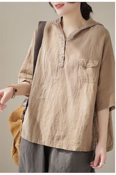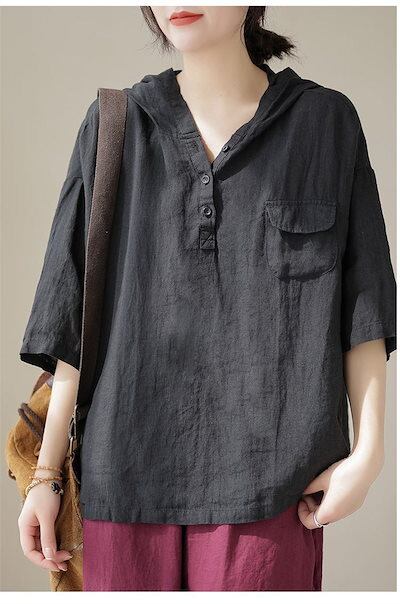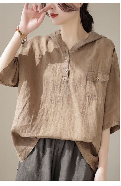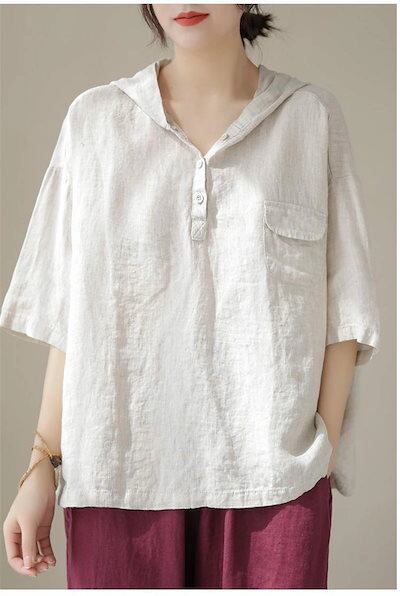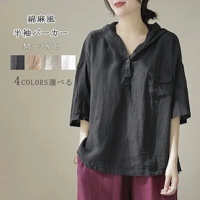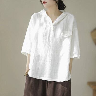 パーカー トップス 七分袖 シャツ 白シャツ レディース フード付き プルオーバー 半袖シャツ 夏 ブラウス 綿麻風 無地 大きいサイズ シャツブラウス 白シャツ 綿シャツ ゆったり 体型カバー 通気