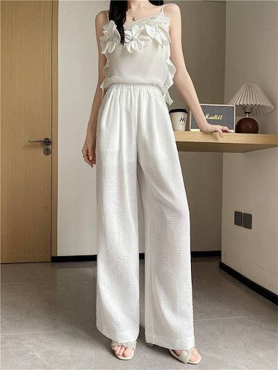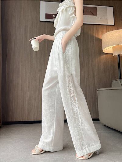 パンツ レース ワイドパンツ レディース 新作 チノパンツ 透かし編み サイドレース 薄手 裏地付き ロングパンツ ボトムス デザイン感 ストレートパンツ ワイド ハイウエスト 体型カバー 春 夏 着
