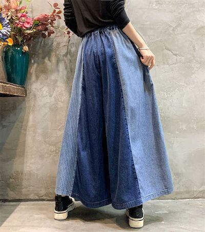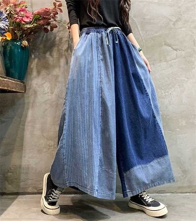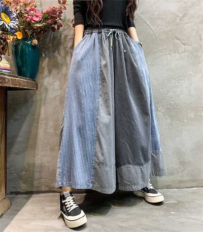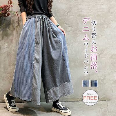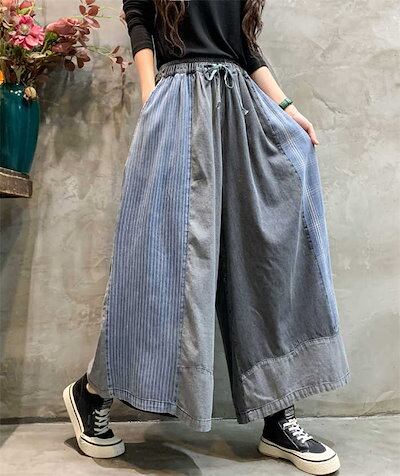 ワイドパンツ デニム ガウチョパンツ レディース ロングパンツ 9分丈 切り替え チェック ストライプ 体型カバー ウエストリボン 春 秋冬
