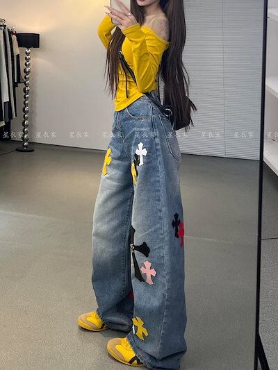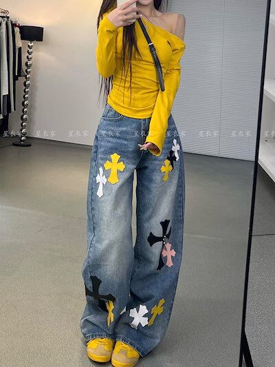クロスワイドジーンズ 十字架ワッペン レディース ジーンズ デニム ジーパン パンツ ズボン ボトムス 10代 20代 30代 40代 y2k ストリートコーデ アメカジコーデ 海外コーデ C636