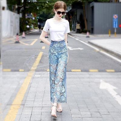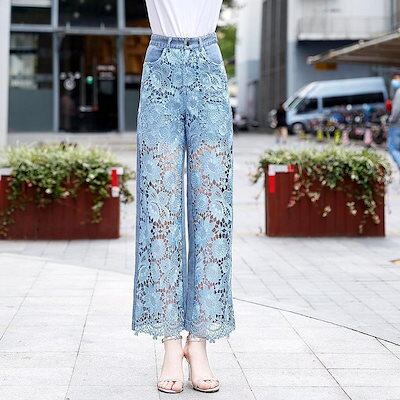 デニムボトムス 秋 デニムパンツ ハイウエスト 着痩せ デニム ワイドパンツ レディース 夏 デニム ズボン 透かし彫りレース 設計 ジーンズ ゆったり ストレート デニム パンツ