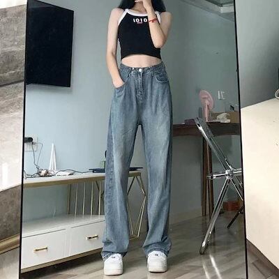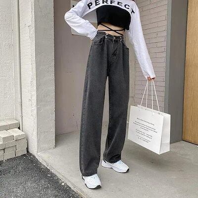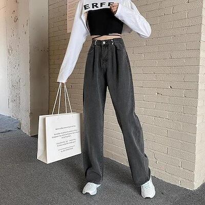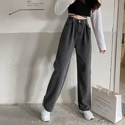 ハイウェスト パンツ 調節可能 デニムパンツ 春秋 薄手 ダークグレー ジーンズ デニム 着痩せ ハイウェスト ストレート ゆったり ワイドパンツ