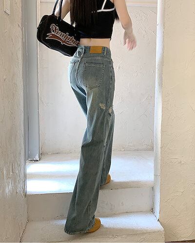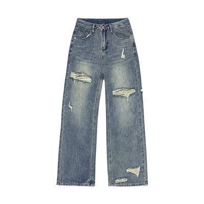 デニムパンツ 破れた穴 ジーンズ レディース 秋 ヴィンテージ ハイウエスト ワイドレッグ モップズボン 韓国