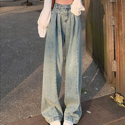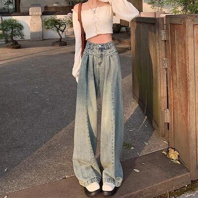 デニムパンツ ヴィンテージストレートジーンズ レディース新作 ハイウエストドレープワイドパンツ