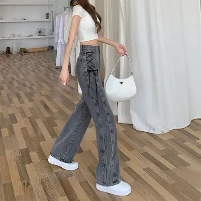 デニム激?れ人気商品 脚長効果!デニムパンツ かっこいい!スラックスパンツ ストレートジーンズ 春夏スモーキーグレー バンド ins ゆったり ワイドパンツ