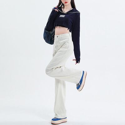 デニム激?れ人気商品 脚長効果!デニムパンツ かっこいい!スラックスパンツ ストレートジーンズ 春夏 ハイウエスト ホワイト ゆったり ワイドパンツ