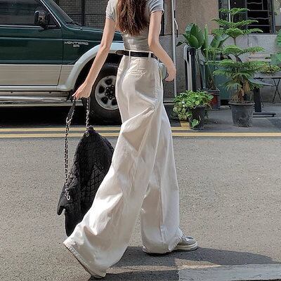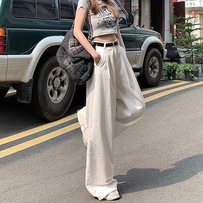 デニム激?れ人気商品 脚長効果!デニムパンツ かっこいい!スラックスパンツ ストレートジーンズ 春夏 ハイウエストアメリカン ホワイト ゆったり ワイドパンツ