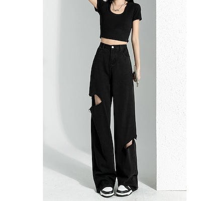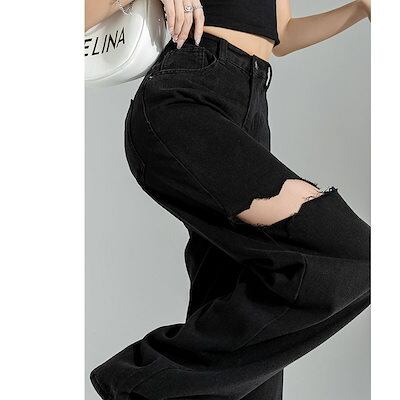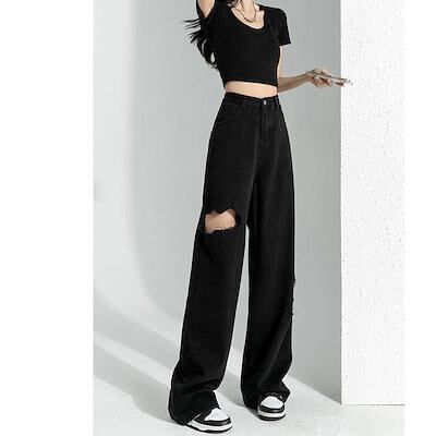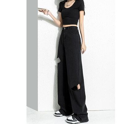 脚長効果!デニムパンツブロークンホールデニム女性夏ルーズストレートパンツ薄いワイドレッグロングパンツ