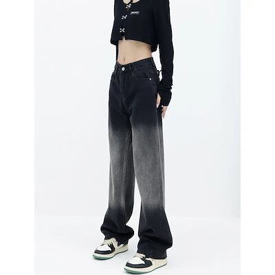 脚長効果!デニムパンツウォッシュドグラデーションストレートジーンズレディースハイウエスト細身ワイドパンツパンツ