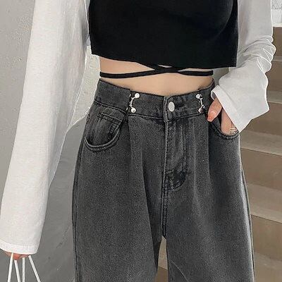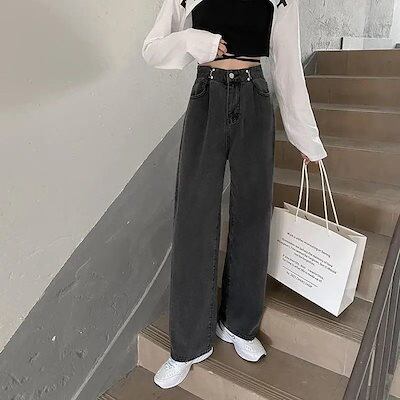 デニム調節可能 春秋 薄手 ダークグレー ジーンズ ハイウェスト ストレート ゆった り 着痩せ ワイドパンツ