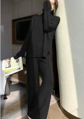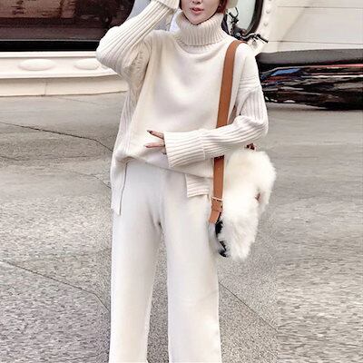 【高級感】2024レディースニットセット秋冬新作 タートルネックセーター+ワイドパンツ/ニット二点セット/怠惰な風/オシャレ/気質 上下レディースセット/通勤/長袖セーター/ロングパンツ/二点セット